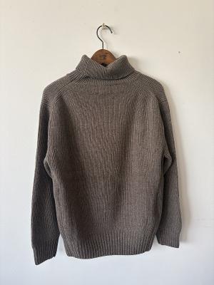 東北地方でハンドフレーム(手横編み機)のみでニットウェアを製作している職人の手で作られた貴重なニットです。糸はオーストラリアでも特に羊毛の質が高いジロン地方産のメリノ種の中で、生後6ケ月以内に刈り取った仔羊の毛を、更に繊維の細いものを厳選し、紡績した糸です。(スーパーエクストラファインラムと呼ばれる細さです。)度詰めで時間をかけて人力で編み立てているので保温性が高く、北国の気温の低い地域でも肌着の上に着用するだけでとてもあたかかく過ごすことができます。家庭での水洗いも可能です。