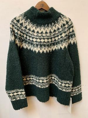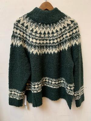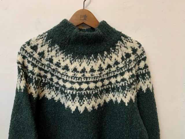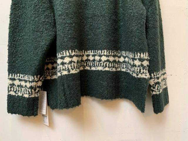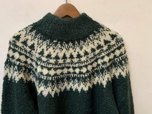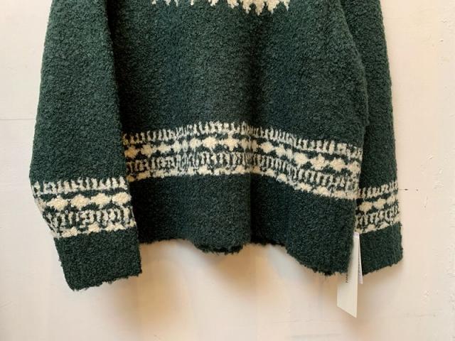 ブークレ糸で編んだ求心柄ジャガードニット。フランス語で”輪”という意味をもつブークレ糸は、糸の表面にたくさんの輪っかがあり、この糸をローゲージで編むことで編地にポコポコ感が生まれます。手編み風のノルディックな雰囲気の柄に、可愛らしい表情がプラスされた仕上がりです。