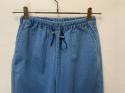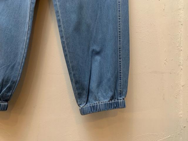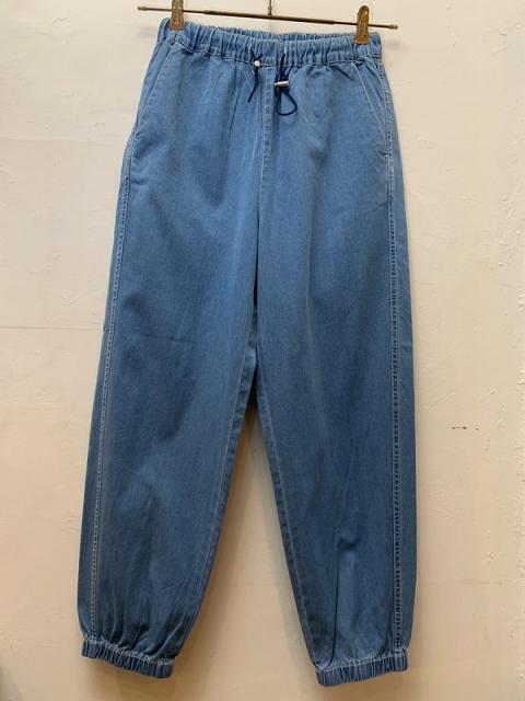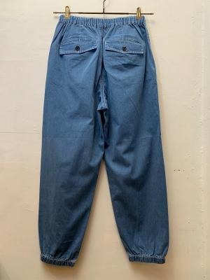シャンブレライクのデニム生地を使用したイージーパンツ。ウエストに金属のストッパーを使用し、飾りにもなりますがさらに紐を絞っても調整が効きます。光沢が上品見えする、軽くて便利なカジュアルアイテムです。