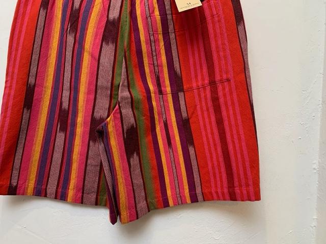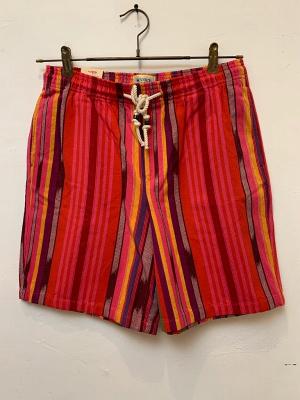 マルチカラーのストライプショートパンツです。赤をベースにした遊び心満載のカラーリングが目を惹きます。個性を引き出し、存在感のあるアイテムです。ウエストはゴムと紐の仕様なのでリラックスして履き続ける事が可能です。