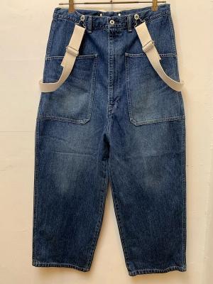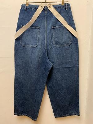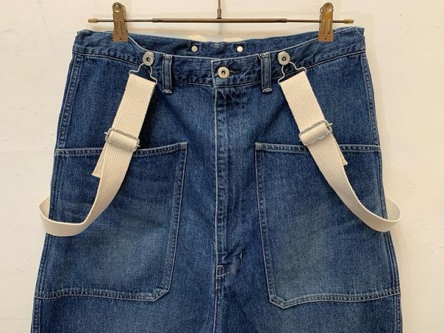 一年を通して着やすい10.5オンスのデニムを使用したサスペンダー付きパンツ。Tシャツの上にさらっと着られるオーバーサイズで、US NAVYのデッキパンツのような大きなパッチポケットが特徴です。サスペンダーは取り外し可能で、外した際はウエスト紐で調整することもできます。