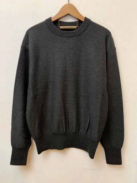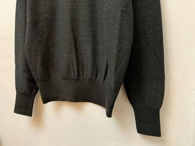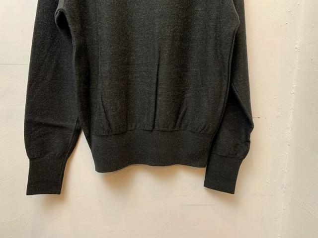ウールとアルパカの混紡ですが、どちらも南米産のものを合わせることで、芯がしっかりしながらも手触りは柔らかく弾力性があり、メンズらしい素材が仕上がりました。その素材を10ゲージの編機で、更に天竺よりも少し厚みが出るスムース編みにすることで、微妙に今までのcomm. arch.には無かったハイゲージとミドルゲージの間のP/Oに仕上がりました。デザイナーが約10年前に海外で購入したヴィンテージの軍モノニットの色、編地、リブの厚みなどを取り入れながらも、昨今の暖冬でも無理なく毎日着用できるようにデザインしました。