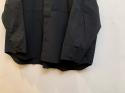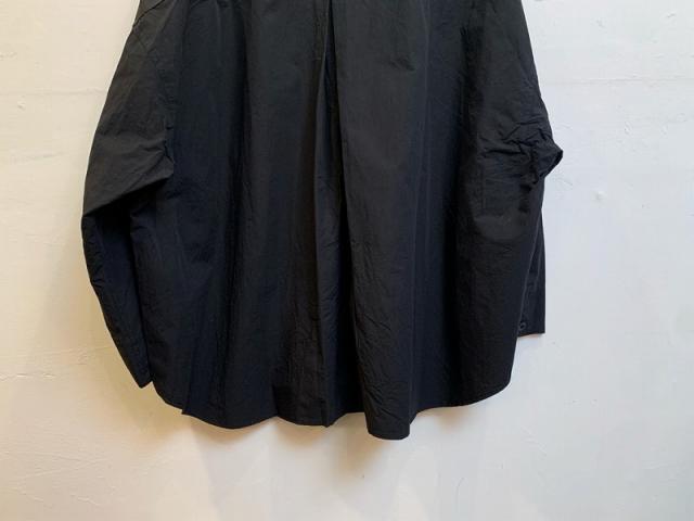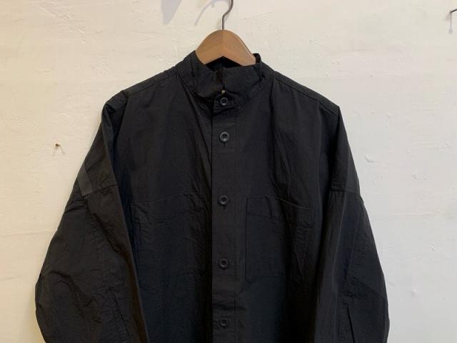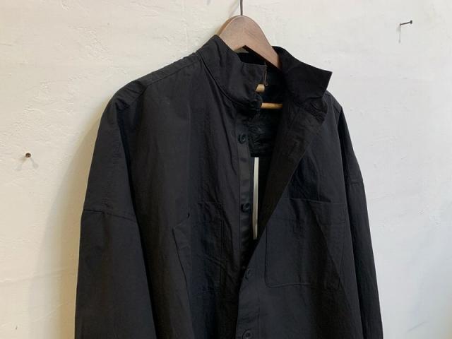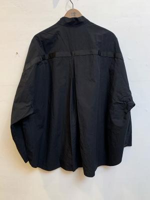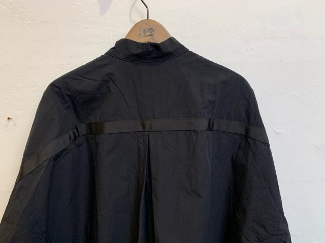 最大の特徴は、その独創的なパターンワーク。かなり広めに取った身幅、着物スリーブを思わせる変形的な形状の袖、スタンドカラーと通常のシャツカラーの中間のような、ウィングカラーにも似た襟など、細部にまでこだわり抜いたディテールが光ります。ヨーク下と下前に施されたテープもさりげないアクセントに。