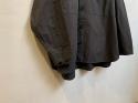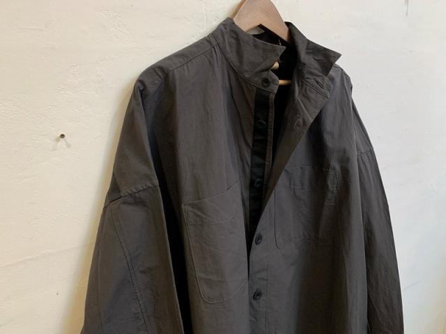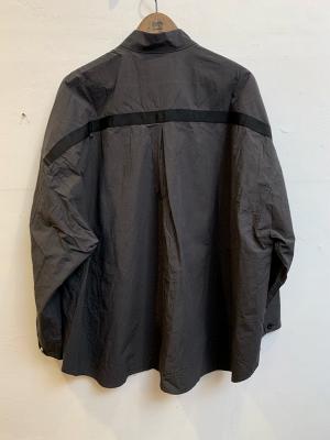 最大の特徴は、その独創的なパターンワーク。かなり広めに取った身幅、着物スリーブを思わせる変形的な形状の袖、スタンドカラーと通常のシャツカラーの中間のような、ウィングカラーにも似た襟など、細部にまでこだわり抜いたディテールが光ります。ヨーク下と下前に施されたテープもさりげないアクセントに。