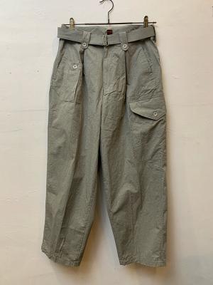 イギリス軍の40年代タイプのグルカパンツとベルギー軍のミリタリーパンツを融合させた、独創的なデザインに仕上げました。最大の特徴は、片側に配置されたガンポケットとカーゴポケット!私の大好きなアイテムを融合させたこのパンツは、共生地で長めに作ったベルトもアクセントになっています。