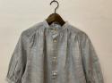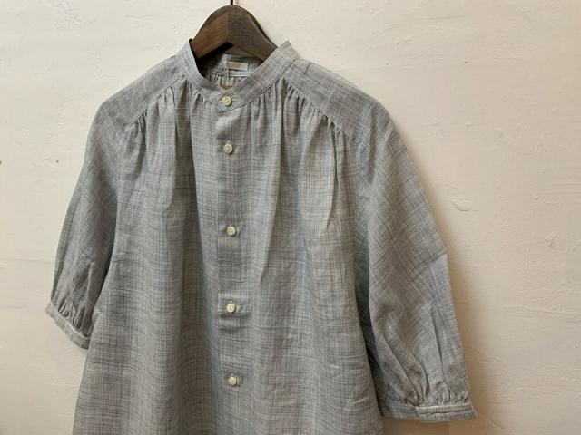 素材は麻の中でも繊維の太さが均質なラミー100%使用し、経糸と緯糸に異なる色のトップ糸を張り織り上げた、贅沢なシャンブレーです。上品な透け感があり、見る角度によって少々色の見え方が変化する、とても表情のある生地で、ギャザーをたっぷり寄せブラウスを製作しました。