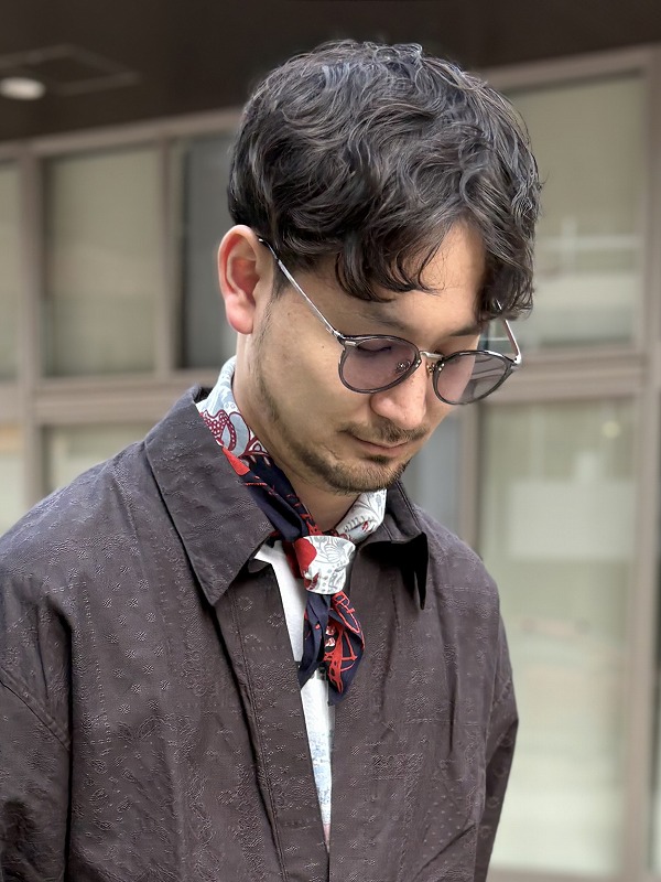 伝統的なバンダナ柄に立体的な織り模様を重ねることで、クラシカルな中にも新鮮さが宿る、まさに現代的な解釈が実現できたと感じています。デザインの核となるのは、あえてボタンを省いた大胆な前開きスタイル。肩線を後ろへと流すことで生まれる丸みのあるショルダーラインは、着る人の体の線と自然に調和するよう考え抜かれています。