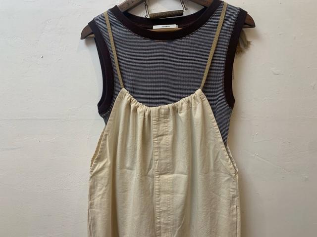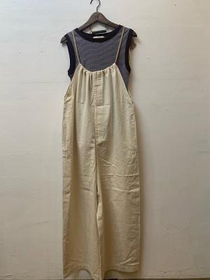 ドローストリングサロペット。キャミソールタイプで、着用した時に肩紐の間の生地が寄ってギャザーになるデザインです。バストから裾までゆったりしたストレスフリーな着心地で、Tシャツと合わせるだけで簡単に夏の装いをお楽しみいただけます。