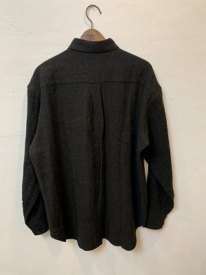 関西の工業地帯の中で、ひとりで旧織機のみを使用して生地を製作している機職人にお願いしました。ベルギーリネンと南米ウール素材で織り上げたキャンバス、へリンボン地を精錬、染色を複数回繰り返して仕上げた生地を使用しております。リネンキャンバスのしっかりとした生地感とシワ感、ウールの起毛感が合わさって、とても雰囲気のある表面に仕上がった生地で厚みと雰囲気のあるシャツジャケットを製作しました。インナーにニットを合わせても良いと思います。