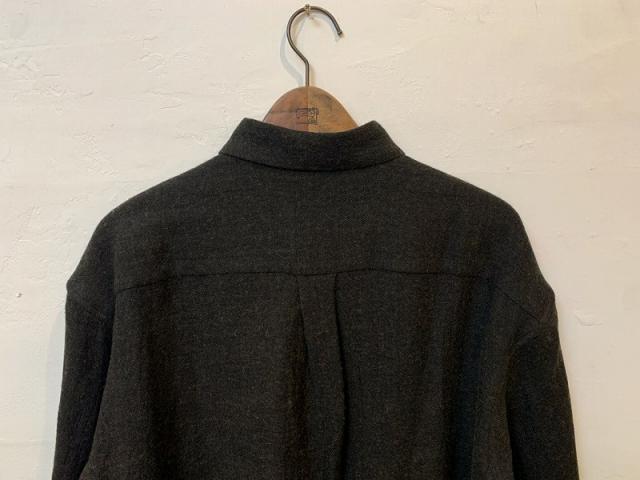 関西の工業地帯の中で、ひとりで旧織機のみを使用して生地を製作している機職人にお願いしました。ベルギーリネンと南米ウール素材で織り上げたキャンバス、へリンボン地を精錬、染色を複数回繰り返して仕上げた生地を使用しております。リネンキャンバスのしっかりとした生地感とシワ感、ウールの起毛感が合わさって、とても雰囲気のある表面に仕上がった生地で厚みと雰囲気のあるシャツジャケットを製作しました。インナーにニットを合わせても良いと思います。