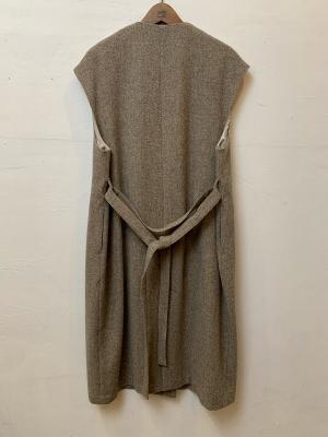 comm. arch. でご好評いただくジレアイテムを、今回は身幅や肩幅を少し広げ、どちらかと言うとスリーブレスコートのようなアウターとしても使用できるしっかり目アイテムに仕上げました。