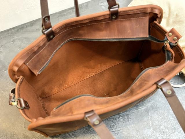 このトートバッグは最高品質のフルグレインレザーを使用しております。安心のファスナー開閉、取り外し自由なショルダーストラップ、内側にポケットと、生活の場面で使い分けが可能です。