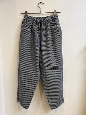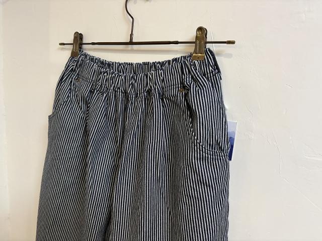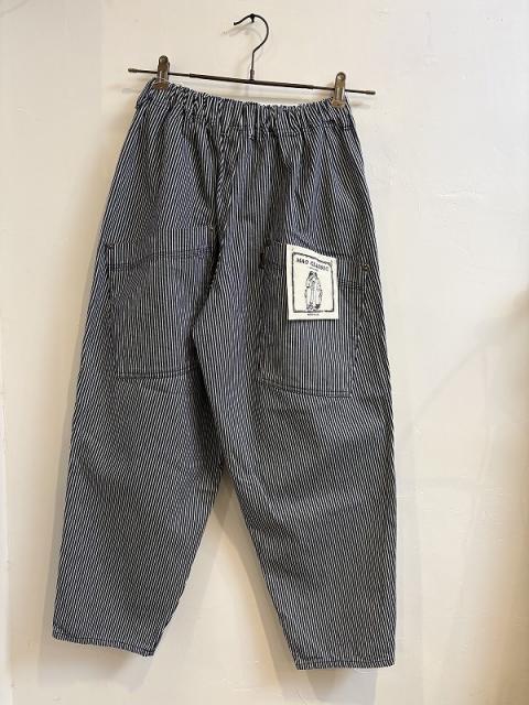 9オンスヒッコリーの生地を使用したロング丈のマオパンツ。ウエスト総ゴムでゆったりとしたデザインは大きな後ろポケットがついたゆったりシルエット。ダボダボな大きいパンツを穿いた少年をイメージしてデザインされました。