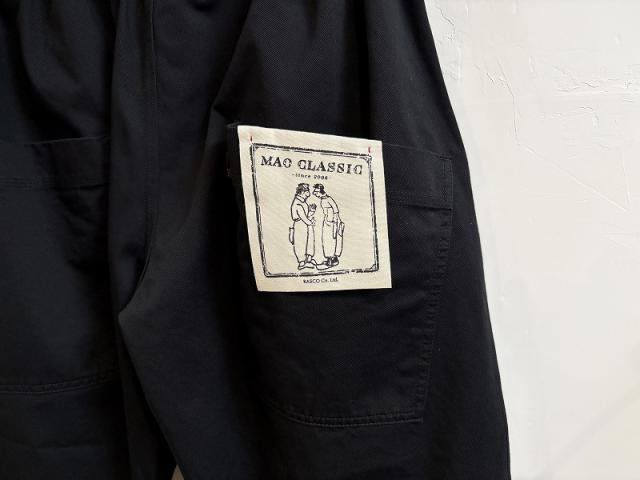 密度を持ったハリのあるコットンチノ素材のマオパンツ。ベーシックカラーとして濃紺とキャメルの二色。
