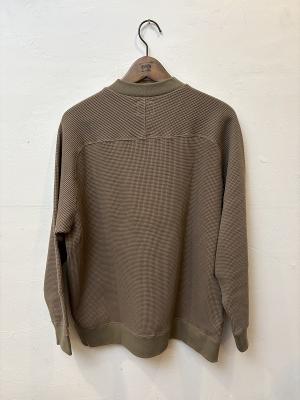 素材はアメリカのテネシー州メンフィスのミシシッピ川周辺で栽培されるメンフィス綿に、SSで多用するスーピマ綿をブレンドした素材を使用しております。どちらの綿も世界的にも歴史のある綿花生産地のものです。メンフィス綿は、乾いた空気と昼夜の大きな寒暖差により、ドライタッチでハリ感のあるタフな特徴があります。その綿を少し甘めに撚糸をした糸を使用し、逆にタイトめにワッフル生地を編みました。そうすることで触感は柔らかいのに、型崩れしづらく安心感のあるワッフルヘンリーP/Oとカーディガンを製作しました。生地がしっかりしているため下着っぽくならず、ウールアイテム時期が終わった春先から初夏まで活躍してくれるアイテムと思います。