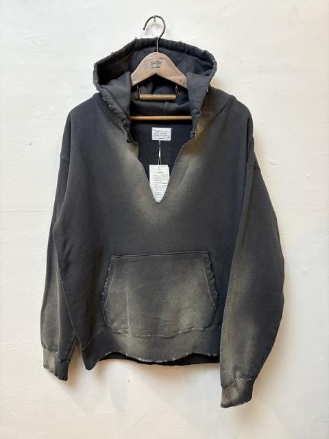 ムラ染めが特徴のスウェットパーカー。10オンスの裏毛をスウェットに仕立て、製品染めとダメージ加工によりヴィンテージライクな雰囲気に仕上げています。ベーシックなシルエットがデニムと好相性で、ラフにカットしたスキッパーデザインは顔回りをすっきりと見せてくれます。暑い時期には中にインナーを入れて、寒い時期にはアウターを重ねてレイヤードアイテムとしても重宝する一着。