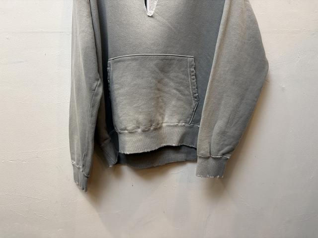 ムラ染めが特徴のスウェットパーカー。10オンスの裏毛をスウェットに仕立て、製品染めとダメージ加工によりヴィンテージライクな雰囲気に仕上げています。ベーシックなシルエットがデニムと好相性で、ラフにカットしたスキッパーデザインは顔回りをすっきりと見せてくれます。暑い時期には中にインナーを入れて、寒い時期にはアウターを重ねてレイヤードアイテムとしても重宝する一着。