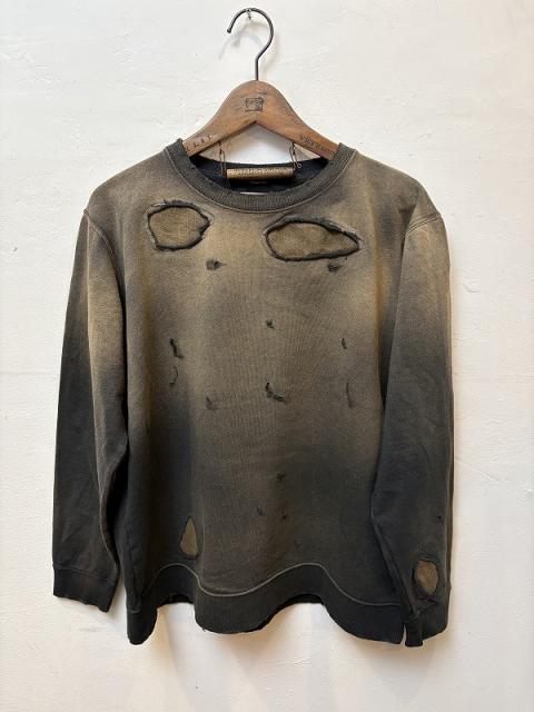 加工感にこだわったヴィンテージなクルーネックスウェット。やや薄手の7.4オンスの裏毛を使用しており、ダメージ加工、さらに随所にリメイク加工を施しヴィンテージライクな雰囲気をプラス。また、製品染めをすることで、経年変化を感じるムラ感のある表情に仕上げています。