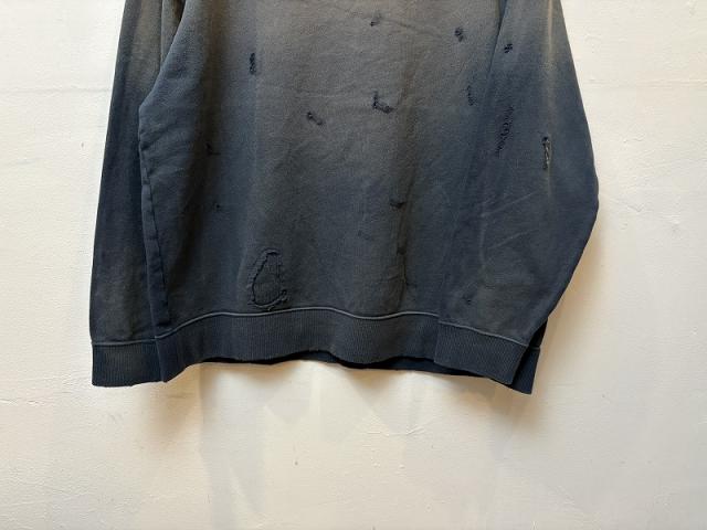 加工感にこだわったヴィンテージなクルーネックスウェット。やや薄手の7.4オンスの裏毛を使用しており、ダメージ加工、さらに随所にリメイク加工を施しヴィンテージライクな雰囲気をプラス。また、製品染めをすることで、経年変化を感じるムラ感のある表情に仕上げています。