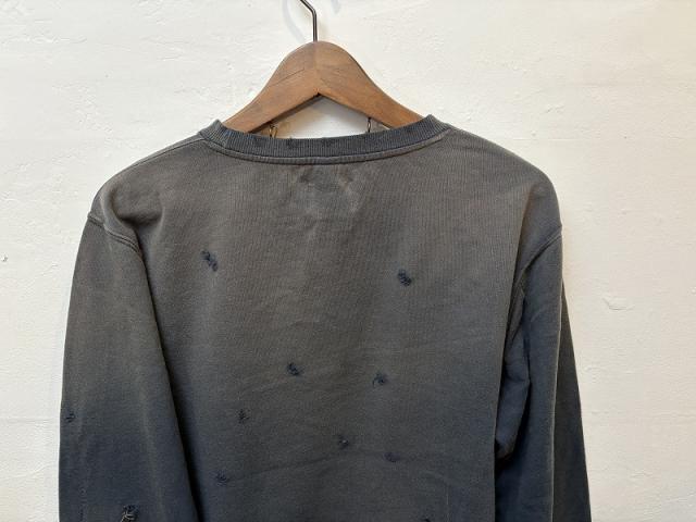 加工感にこだわったヴィンテージなクルーネックスウェット。やや薄手の7.4オンスの裏毛を使用しており、ダメージ加工、さらに随所にリメイク加工を施しヴィンテージライクな雰囲気をプラス。また、製品染めをすることで、経年変化を感じるムラ感のある表情に仕上げています。