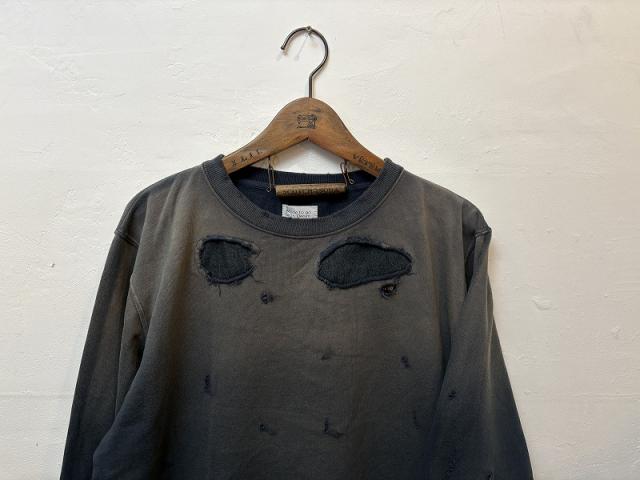 加工感にこだわったヴィンテージなクルーネックスウェット。やや薄手の7.4オンスの裏毛を使用しており、ダメージ加工、さらに随所にリメイク加工を施しヴィンテージライクな雰囲気をプラス。また、製品染めをすることで、経年変化を感じるムラ感のある表情に仕上げています。