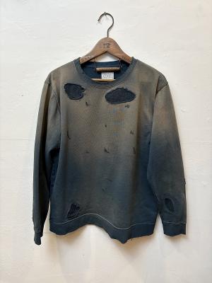 加工感にこだわったヴィンテージなクルーネックスウェット。やや薄手の7.4オンスの裏毛を使用しており、ダメージ加工、さらに随所にリメイク加工を施しヴィンテージライクな雰囲気をプラス。また、製品染めをすることで、経年変化を感じるムラ感のある表情に仕上げています。