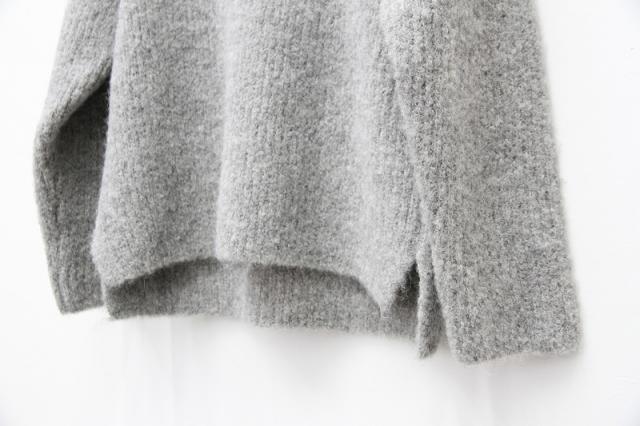 アルパカ(74%)とウール(26%)のみでループヤーンを紡績した毛糸で編み上げられたプルオーバーです。少しゆとりのある身幅で、ボートネックの首周り、サイドスリットが入った前後で段差のある裾のデザイン、リブは袖口のみに付くなど、シンプルでリラックス感のあるプルオーバーに仕上がっています。総針(フルニードル)でしっかりと編み上げているので、程良い重量感と弾力感、高い保温性があり、アルパカならではの滑らかな肌触りと相俟ってまるでウールのタオルに包まれているようなとても気持ち良い着心地になります。一般的に意匠糸(ファンシーヤーン)と呼ばれるこのような糸で化繊を混紡しないのはとても珍しいです。
