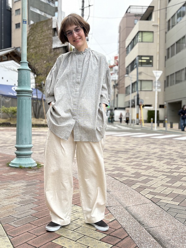 ヨーロッパ産のデッドストック生地を使用し、初春用にたっぷりとギャザーを寄せたブラウスを製作しました。